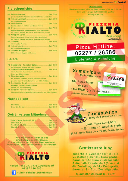 Letztes Jahr bekam ich eine Anfrage einer Pizzeria. Kein Problem, dachte ich, jeder ist gerne Pizza, ich auch! Nach einer guten Besprechung und dem Überblick wie alles sein soll, gestaltete ich folgende Flyer. Eine freundliche Farbe, eine gute Schrift. Leider gingen sie nie in den Druck. Trotzdem, mir gefallen sie, also zeige ich sie jetzt her … wieso nicht, jeder mag Pizza!