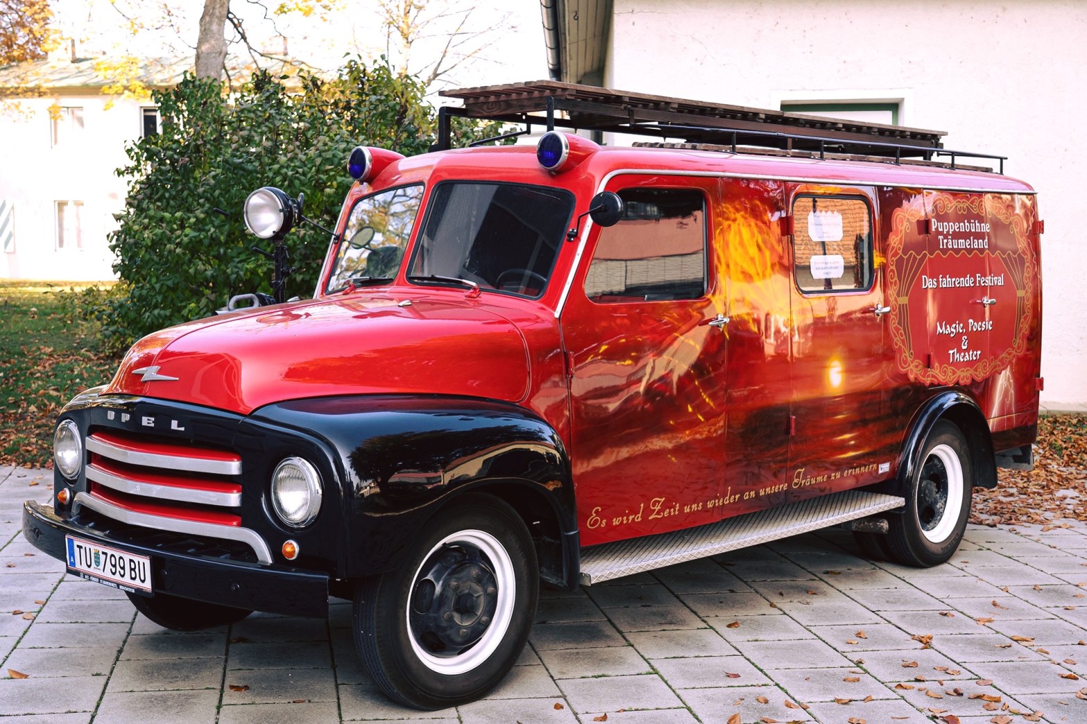 Ein wortwörtlich größeres Projekt hat mich letztes Jahr beschäftigt. Die Beklebung eines alten Feuerwehrautos. Genauer gesagt eines Opel Blitz der zu einem mobilen Puppentheater umgebaut wurde.