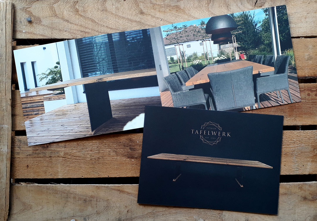 So entstand ein einprägsames Logo sowie ein Folder. Beide sollten die Hochwertigkeit, die Stabilität und das Handwerk hinter den Tische in Sondergrößen bis zu 4 Metern hervorstreichen. Außerdem sollte sich das Portfolio in den kommenden Jahren mit dem selben Corporate Design auf exklusives Interieur erweitern lassen.