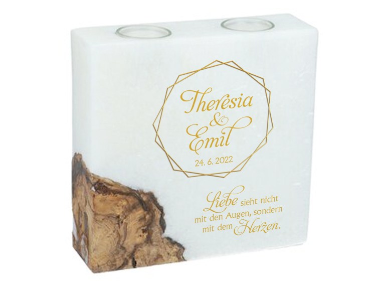 Die Kerzen biete ich euch als runde Stumpenkerze mit einem Teelichteinsatz in der Größe 250 x 90 mm zu € 85,– oder als rechteckige Kerze mit zwei Teelichteinsätzen in der Größe 200 x 200 x 70 mm zu € 125,–.