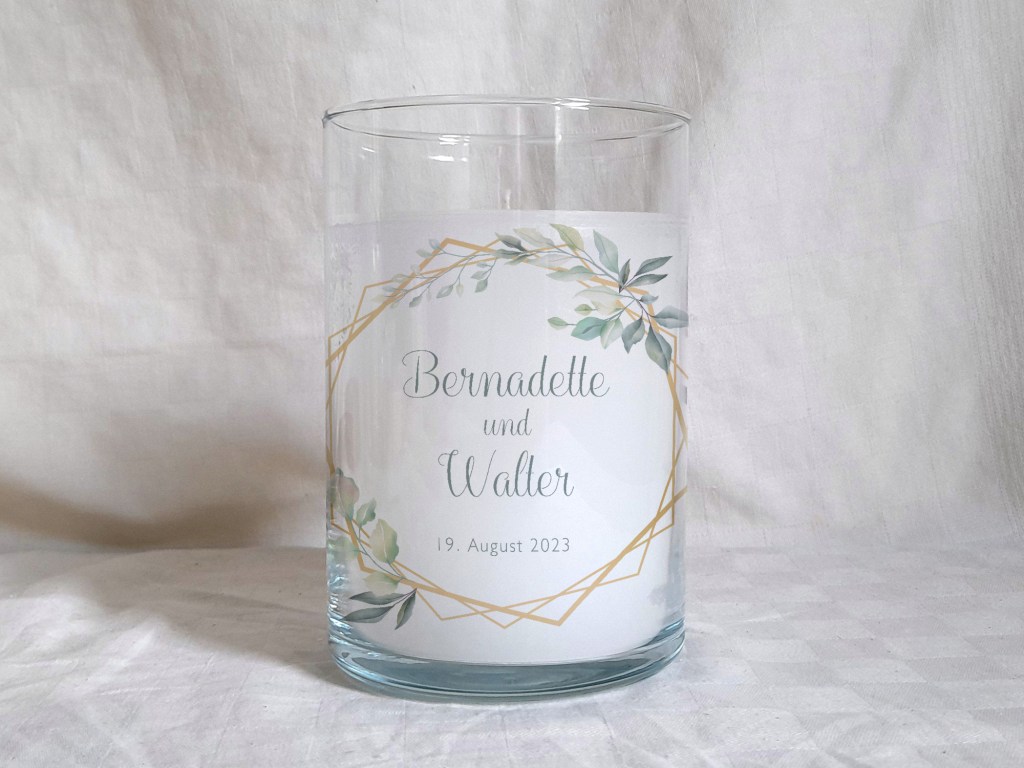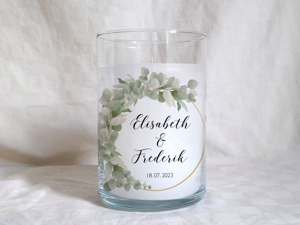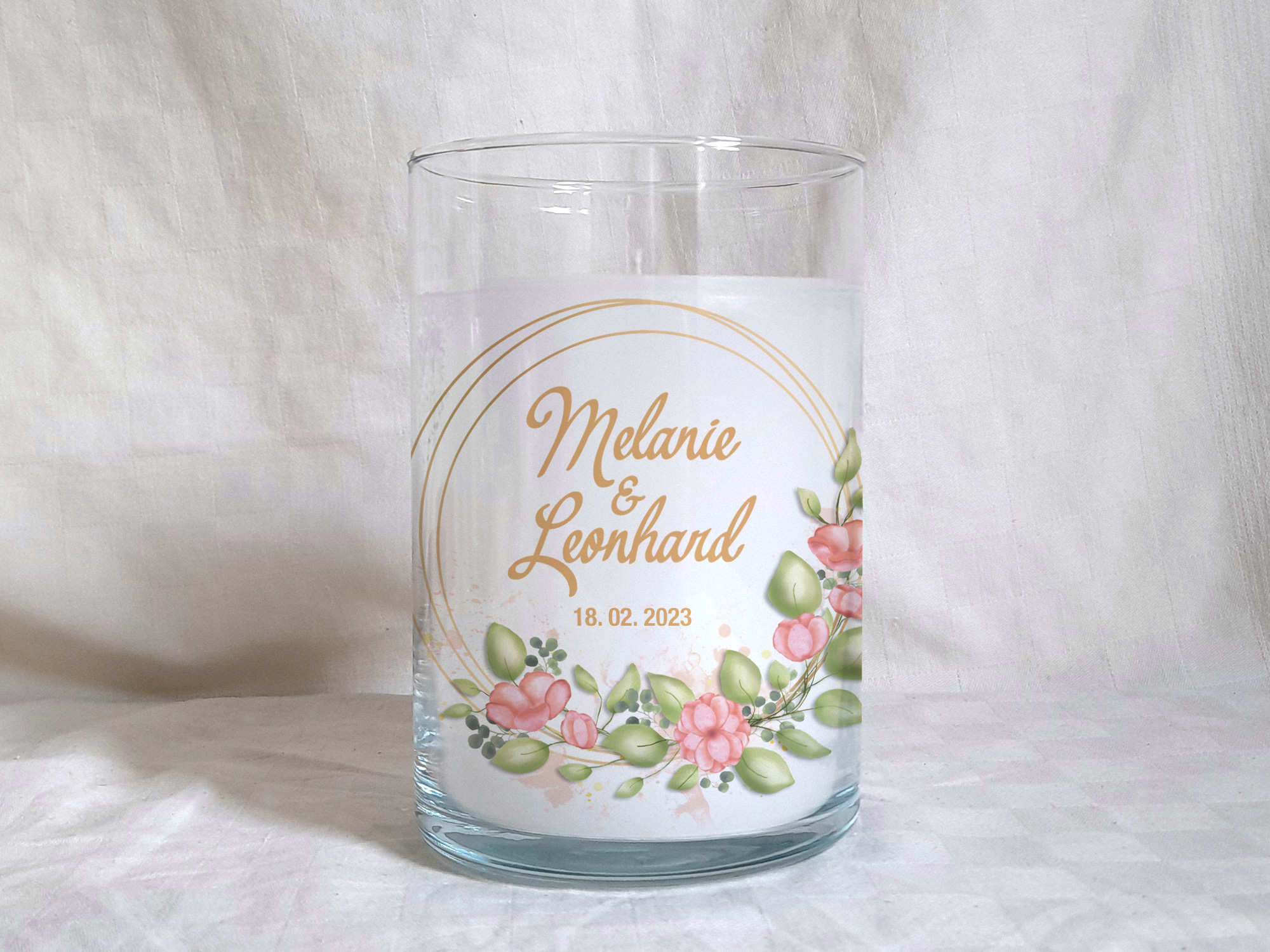 Endlich ist sie da. Die Hochzeitskerze im Glas, direkt bedruckt, gerne auch mit eurem individuellem Design.