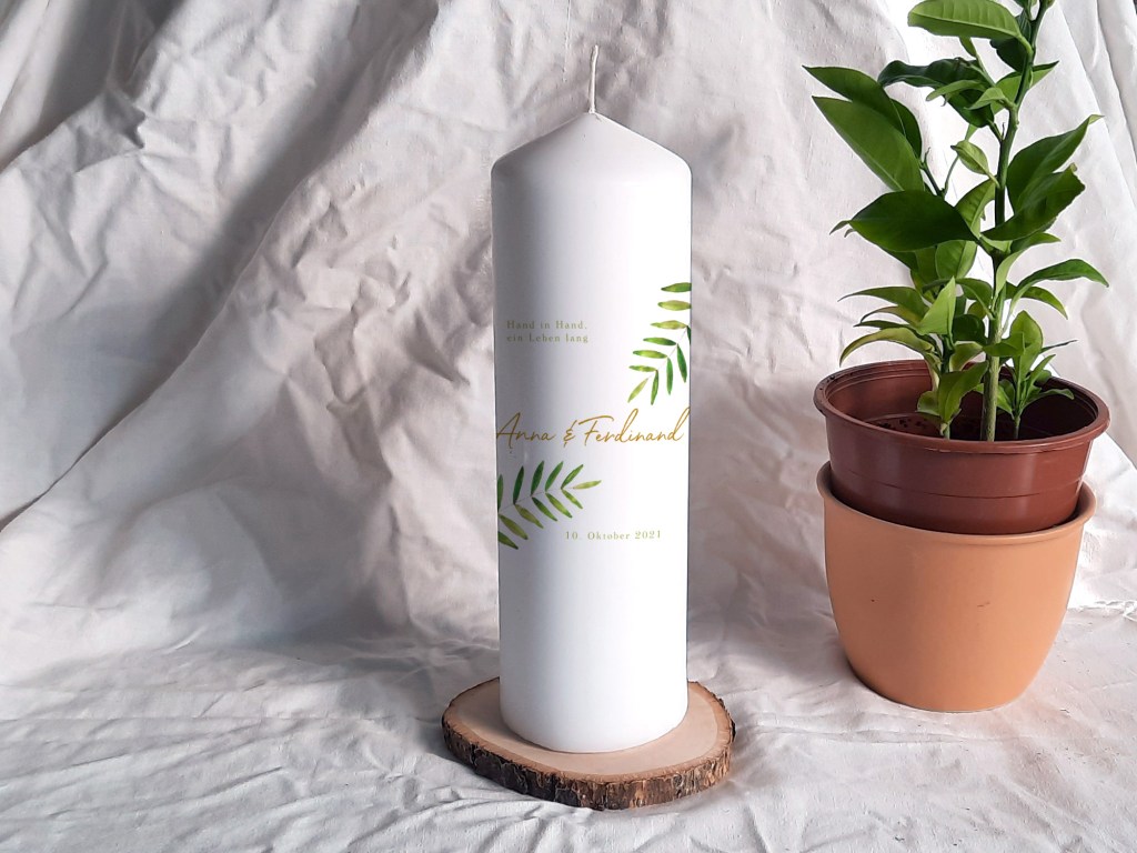 Alle klassischen Hochzeitskerzen werden als Stumpenkerzen produziert. Das Design wird direkt auf die Kerze gedruckt. Die Druckfarben sind lichtecht, Greenguard Gold zertifiziert und EN 71-3 Spielzeugsicherheit konform.