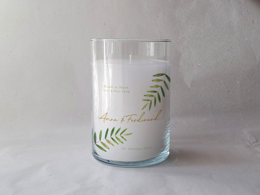 Unsere Hochzeitskerze im Glas ist 16 cm hoch und hat einen Durchmesser von 10 cm. Sie wird im Waldviertel per Hand befüllt und im Tullnerfeld, bei uns im Haus, designed und bedruckt. Gerne auch in eurem individuellem Design.