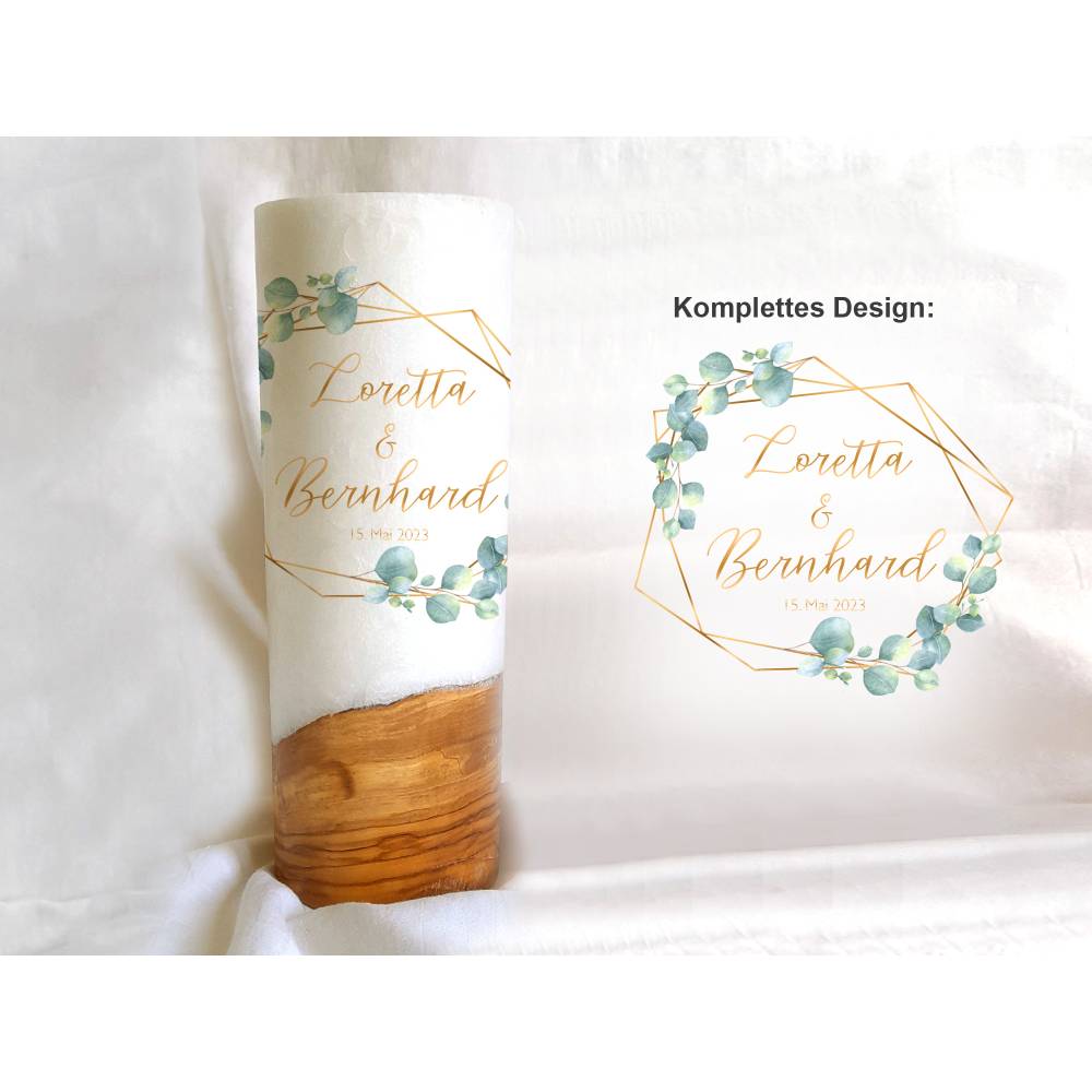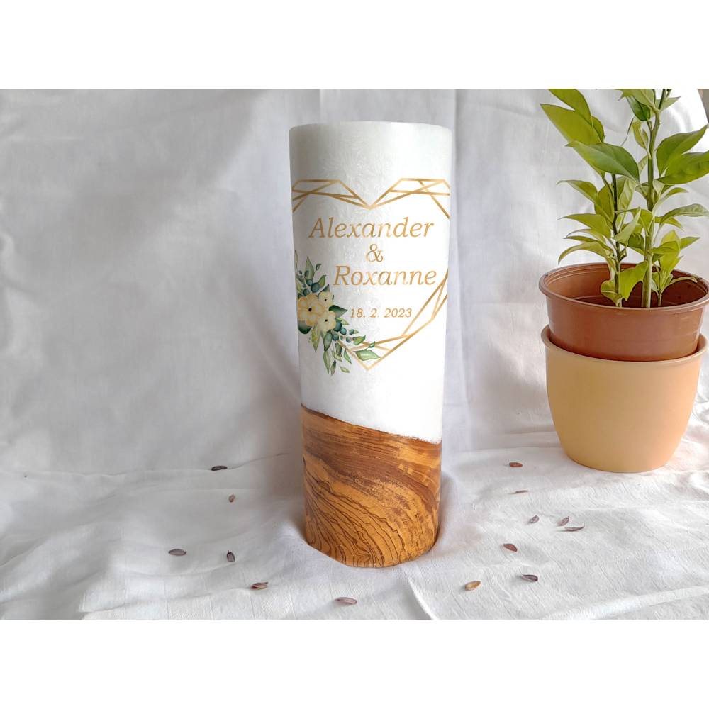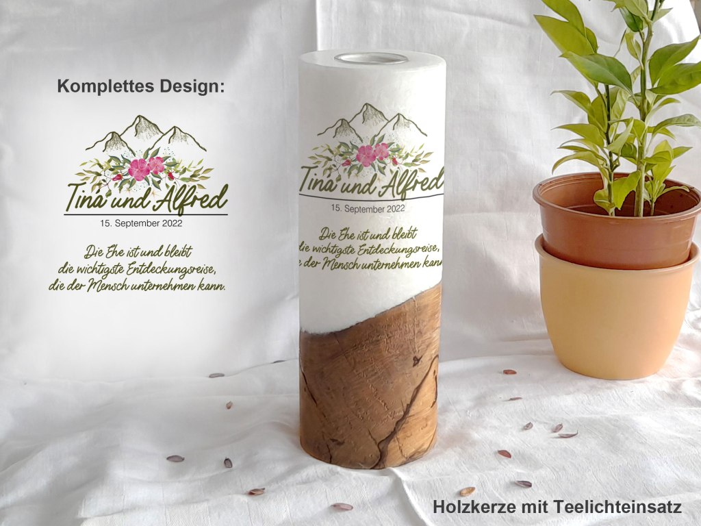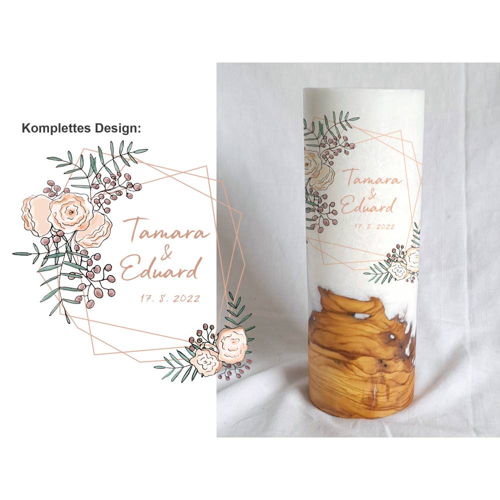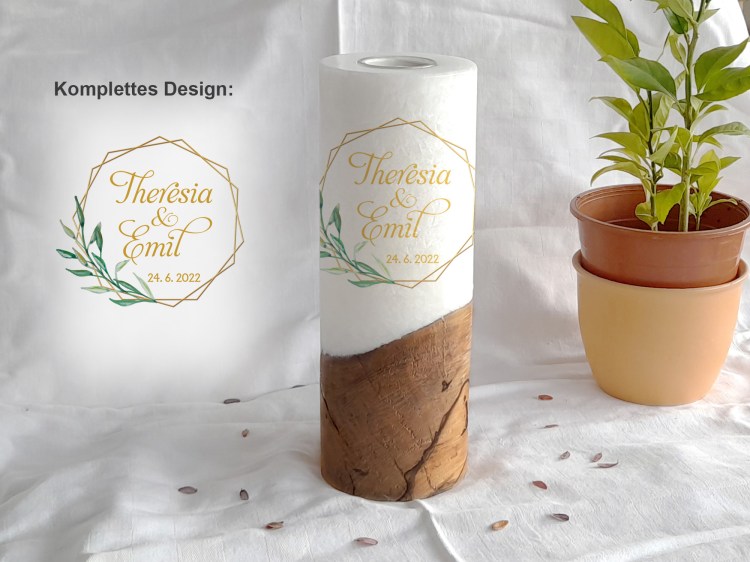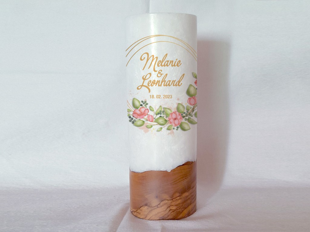Die Holzkerze kommt mit einem wunderschönen Sockel aus Holz. Wobei jedes Holz einzigartig ist. Daher dürfen Sie sich hier auch den Rohling anhand von Fotos selbst aussuchen. Was Ihre Hochzeitskerze mit Holz immer zu einem Unikat macht. Das Design wird direkt auf die Kerze gedruckt. Die Druckfarben sind lichtecht, Greenguard Gold zertifiziert und EN 71-3 Spielzeugsicherheit konform.