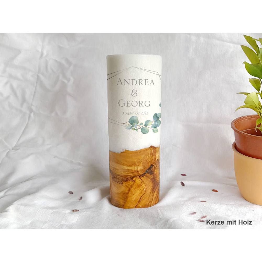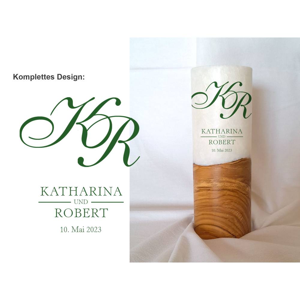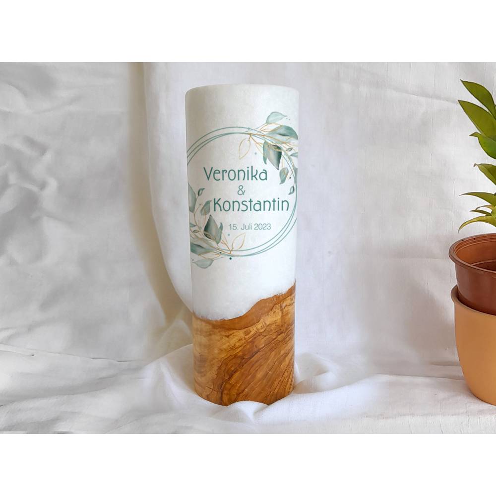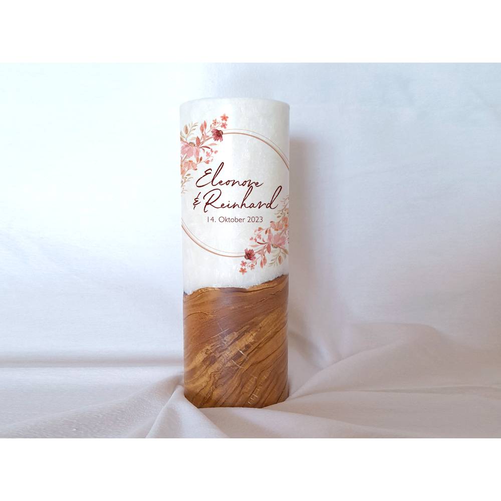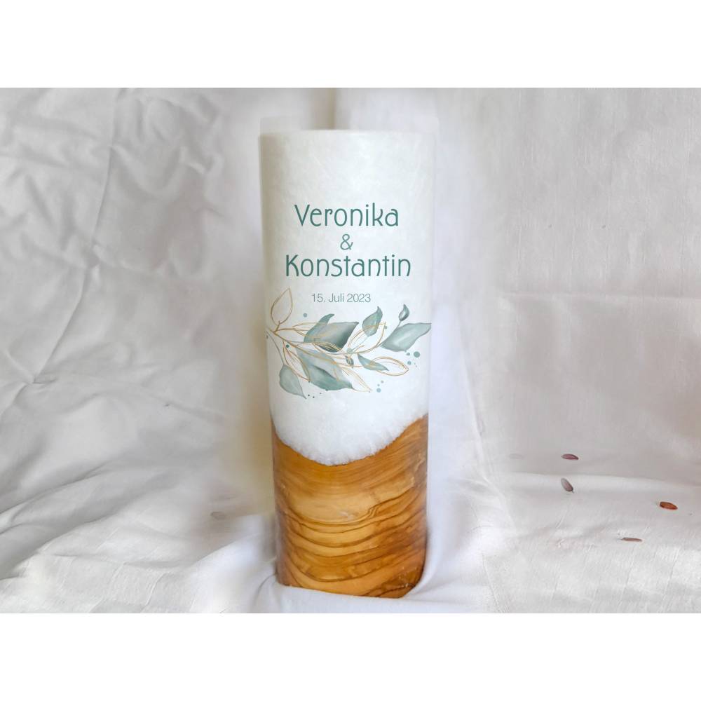 Die Holzkerze kommt mit einem wunderschönen Sockel aus Holz. Wobei jedes Holz einzigartig ist. Daher dürfen Sie sich hier auch den Rohling anhand von Fotos selbst aussuchen. Was Ihre Hochzeitskerze mit Holz immer zu einem Unikat macht. Das Design wird direkt auf die Kerze gedruckt. Die Druckfarben sind lichtecht, Greenguard Gold zertifiziert und EN 71-3 Spielzeugsicherheit konform.