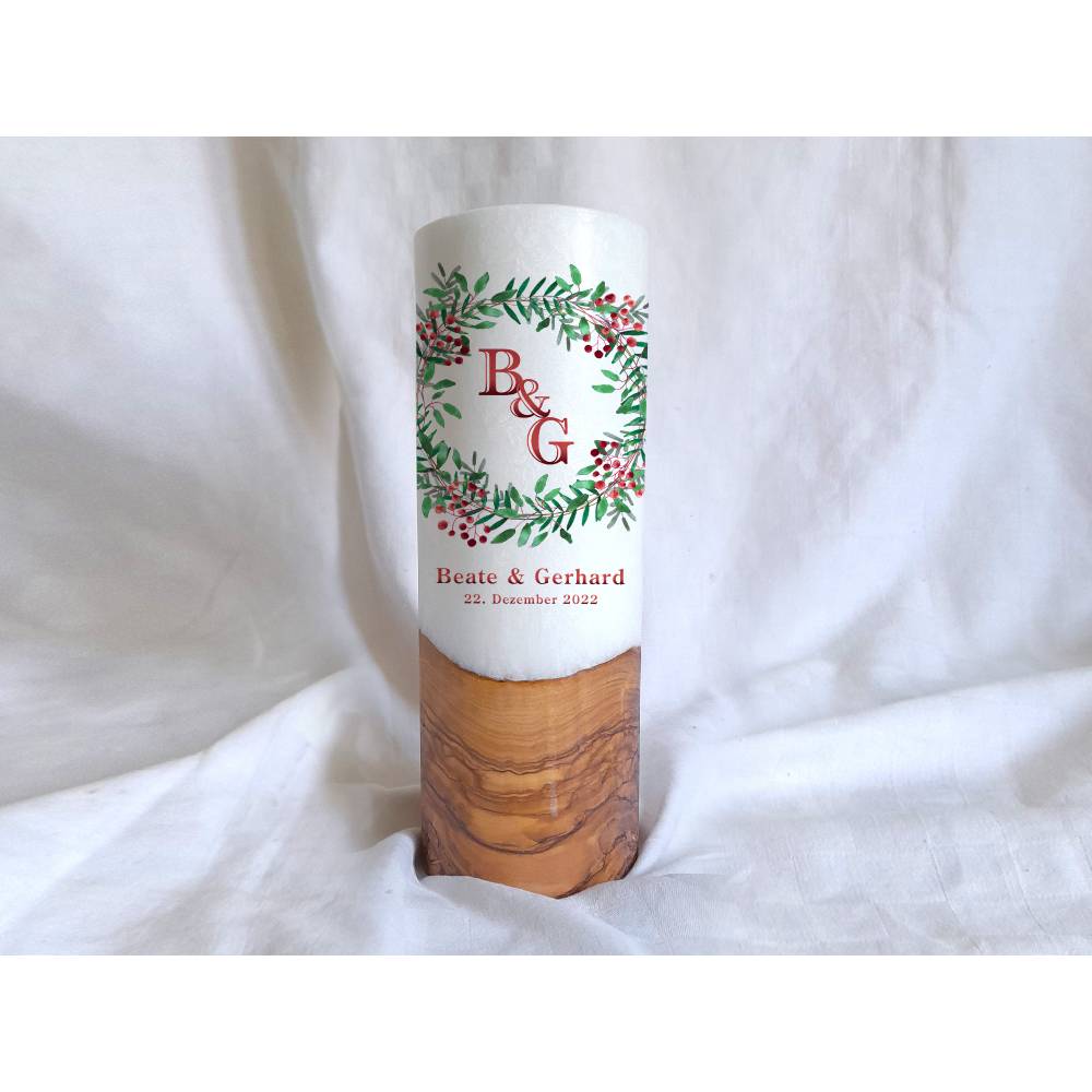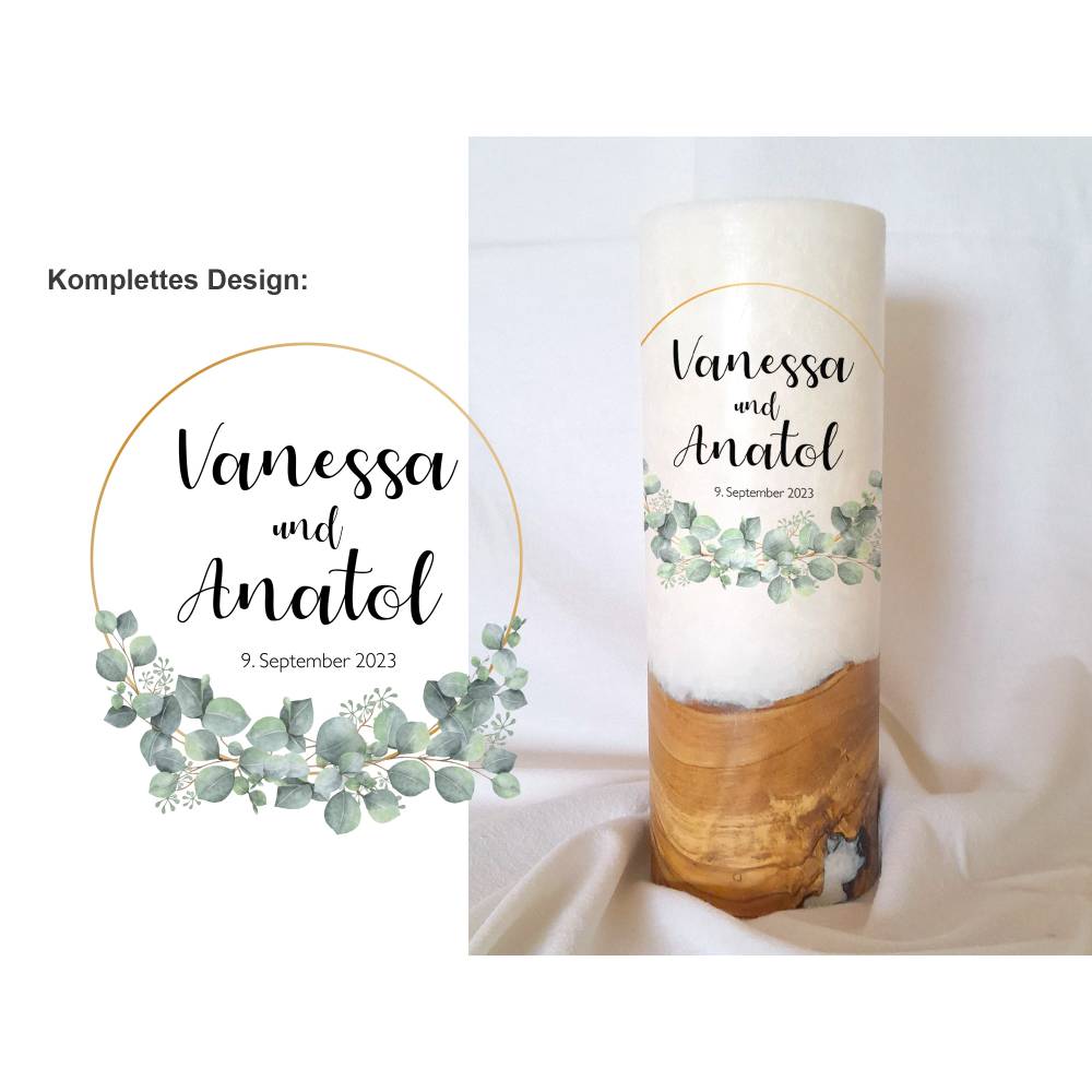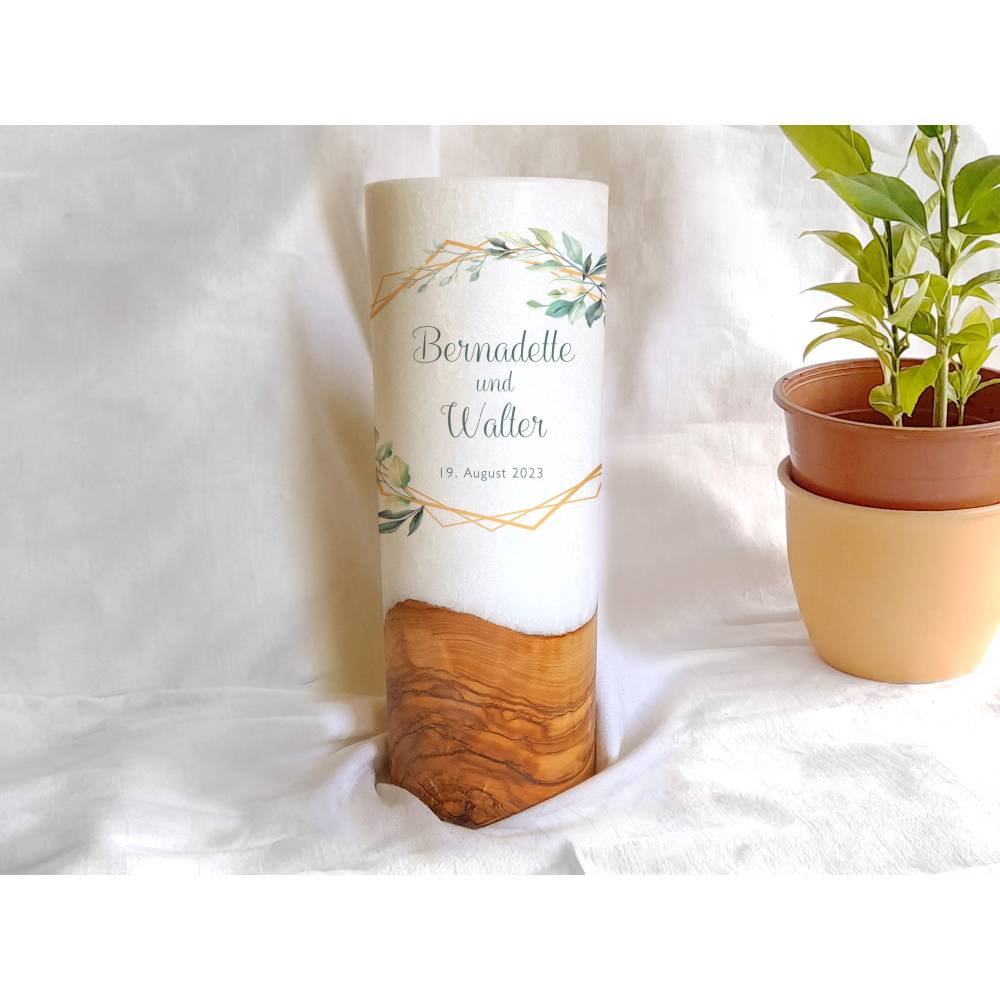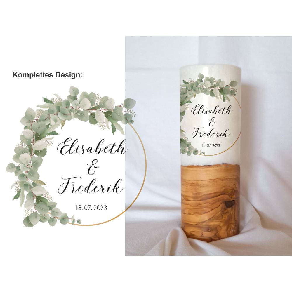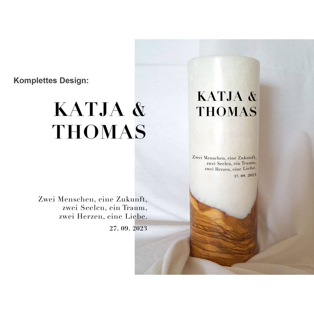 Die Holzkerze kommt mit einem wunderschönen Sockel aus Holz. Wobei jedes Holz einzigartig ist. Daher dürfen Sie sich hier auch den Rohling anhand von Fotos selbst aussuchen. Was Ihre Hochzeitskerze mit Holz immer zu einem Unikat macht. Das Design wird direkt auf die Kerze gedruckt. Die Druckfarben sind lichtecht, Greenguard Gold zertifiziert und EN 71-3 Spielzeugsicherheit konform.